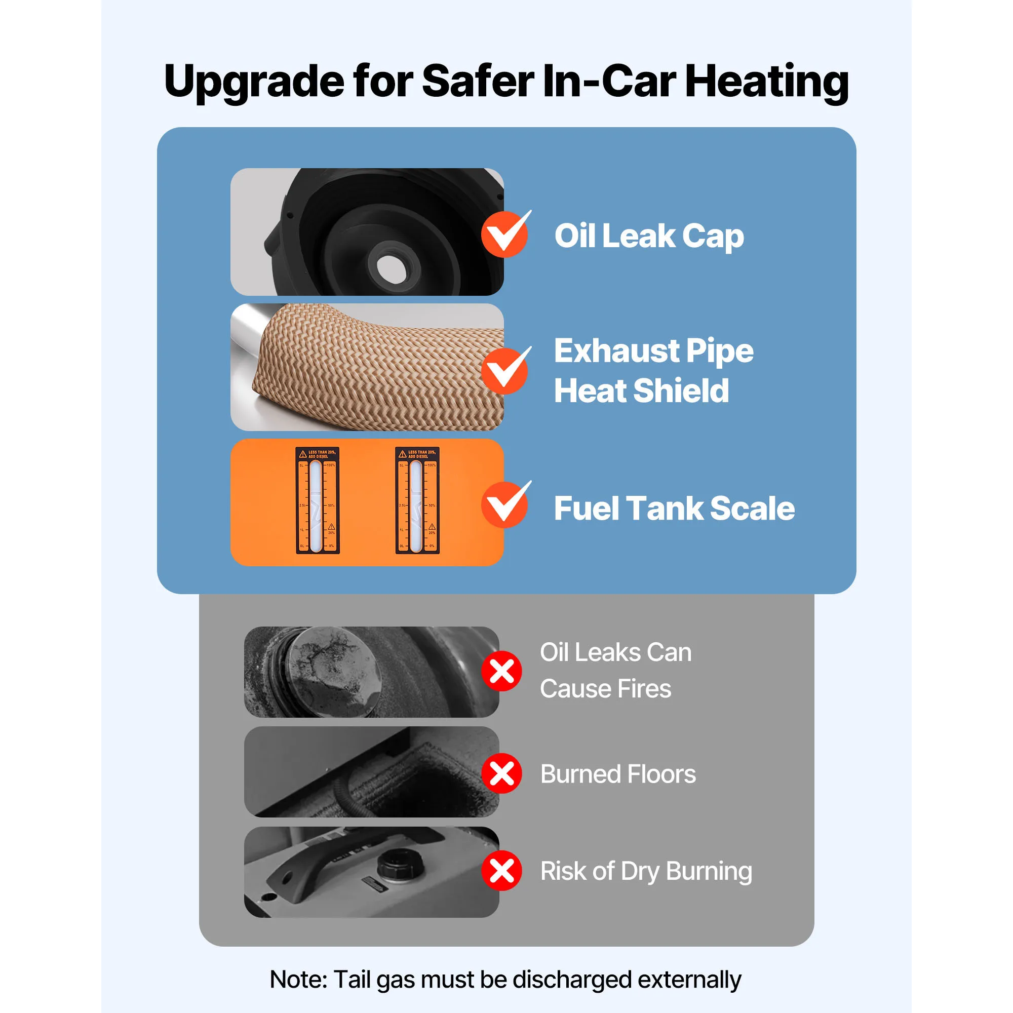 Upgraded Security Features: Enhanced security with a heat-insulated exhaust pipe shield to avoid burns or scorching. The leak-proof fuel cap minimizes risks on rough roads, and the fuel gauge ensures timely refueling, reducing the risk of dry burning