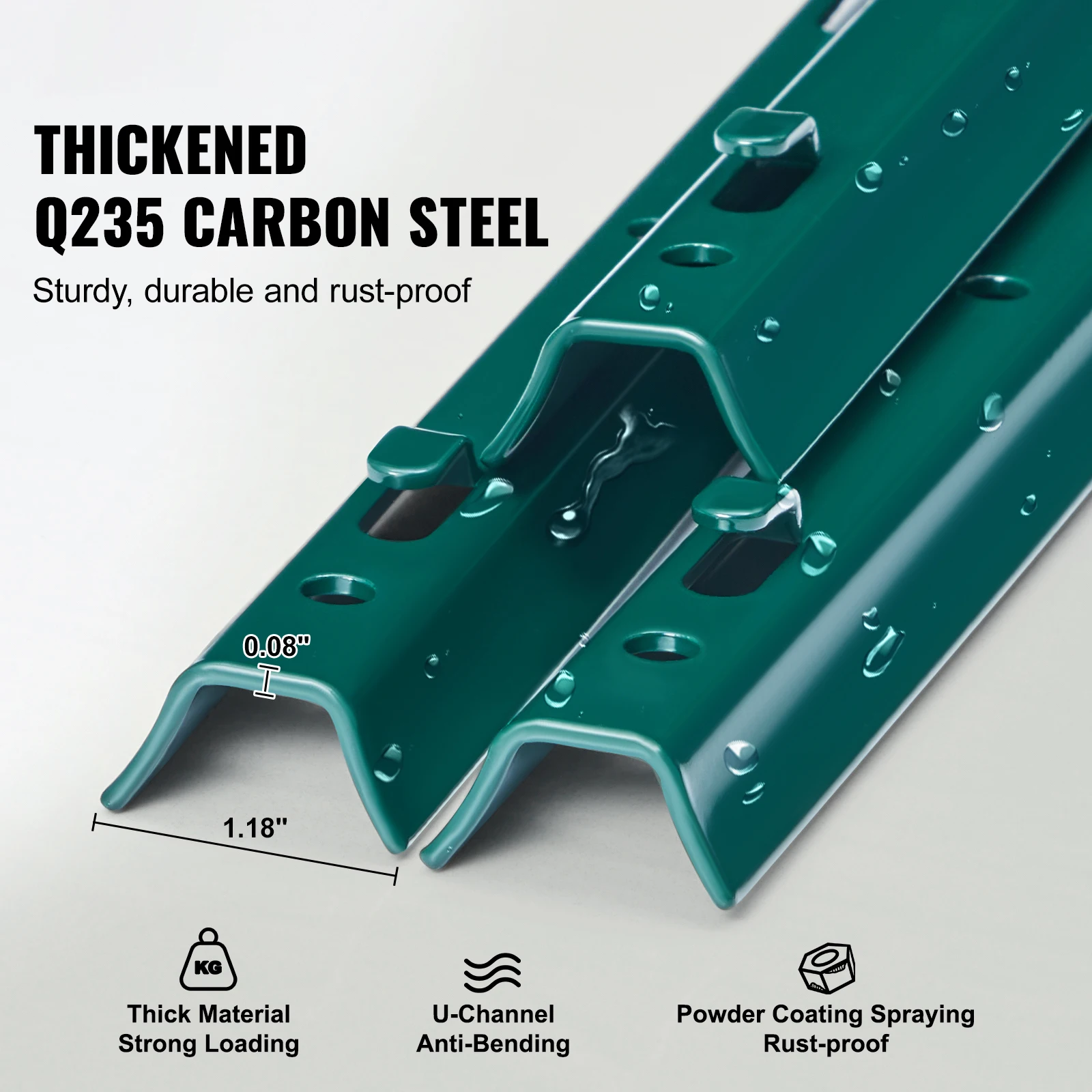 Sturdy & Durable Fence Post: Made from 2 mm (0.08") thick Q235 carbon steel, this fence post offers high strength and rigidity. The U-shaped channel design improves bending resistance, while the powder-coated finish provides UV protection and corrosion resistance, ensuring durability in all weather conditions.